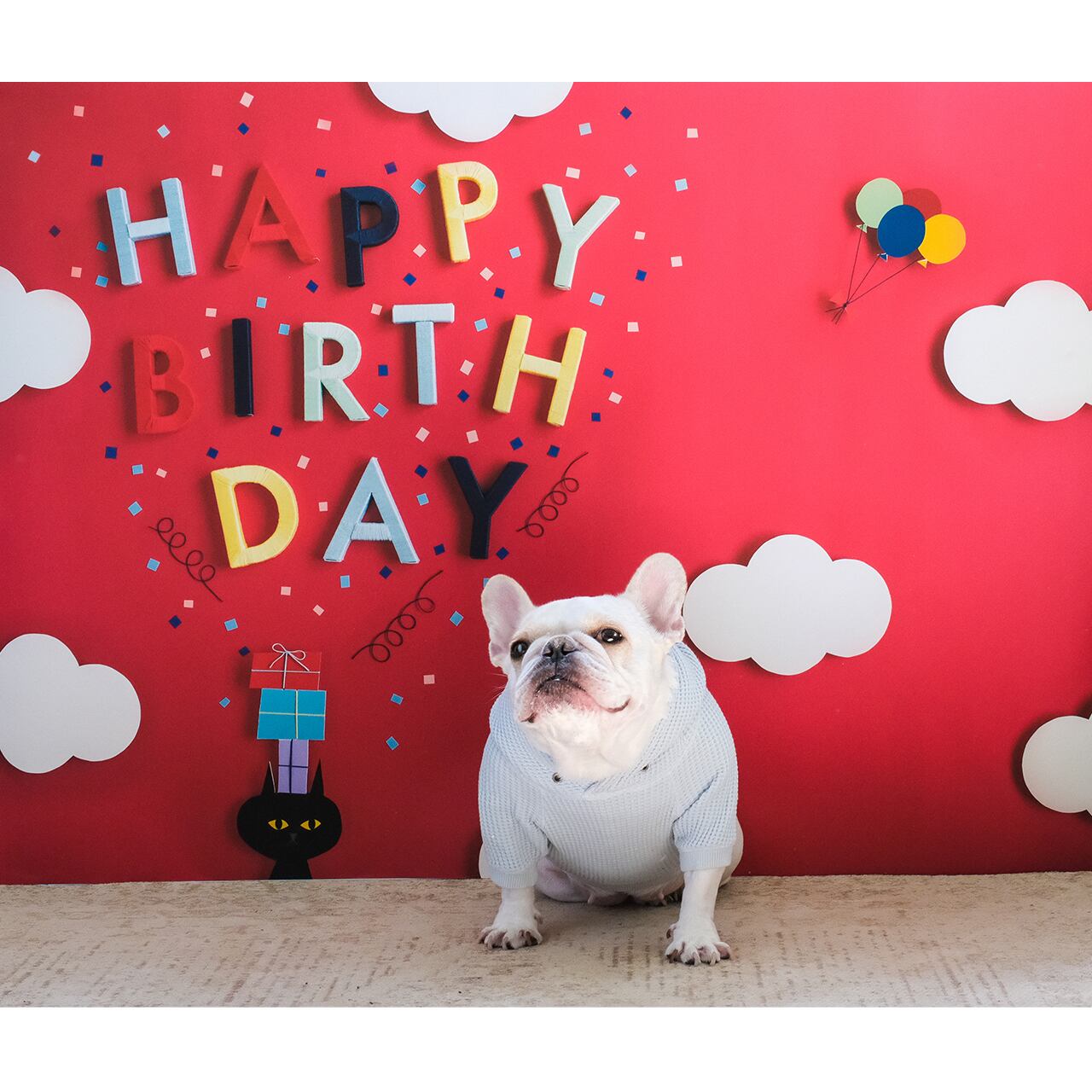カラフル&ポップで楽しいデザイン。ネコが運んできたプレゼントの箱から、<HAPPY BIRTHDAY>の文字とペーパーシャワーが飛び出します。写真に撮るとネコも雲も文字もとっても立体的にリアルに見え、実際にセットがあるかのように見えます。濃い目のピンクの背景は、とても鮮やかで写真映えも!ちょっと個性もあり、人と差を付けたい方にもぴったりです。