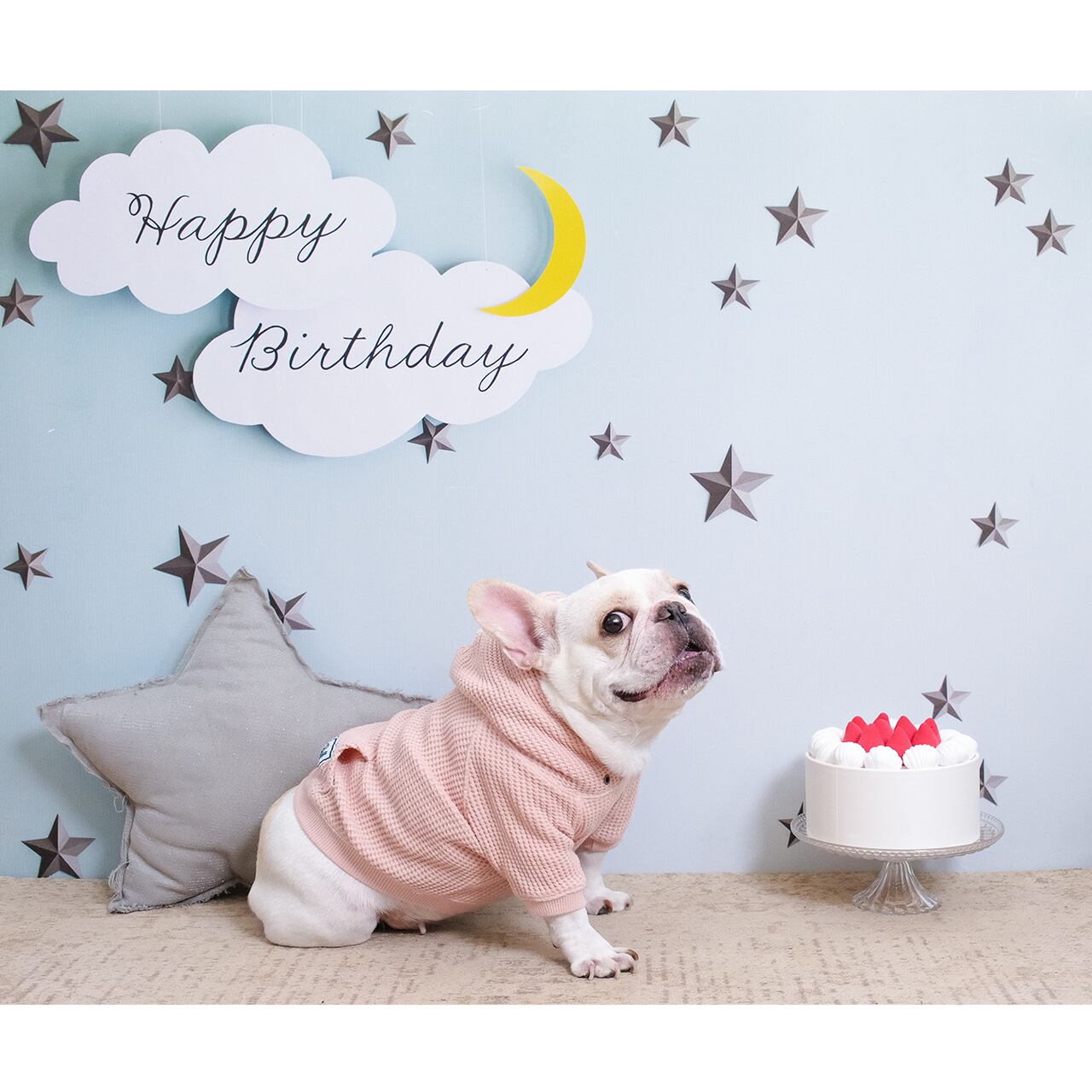 雑誌の1ページのようなオシャレなデザイン。写真にうつせば雲をかたどった<Happy Birthday>の看板と、星が立体的に浮き出て、実際に飾ってあるかのように見える質感が魅力です。