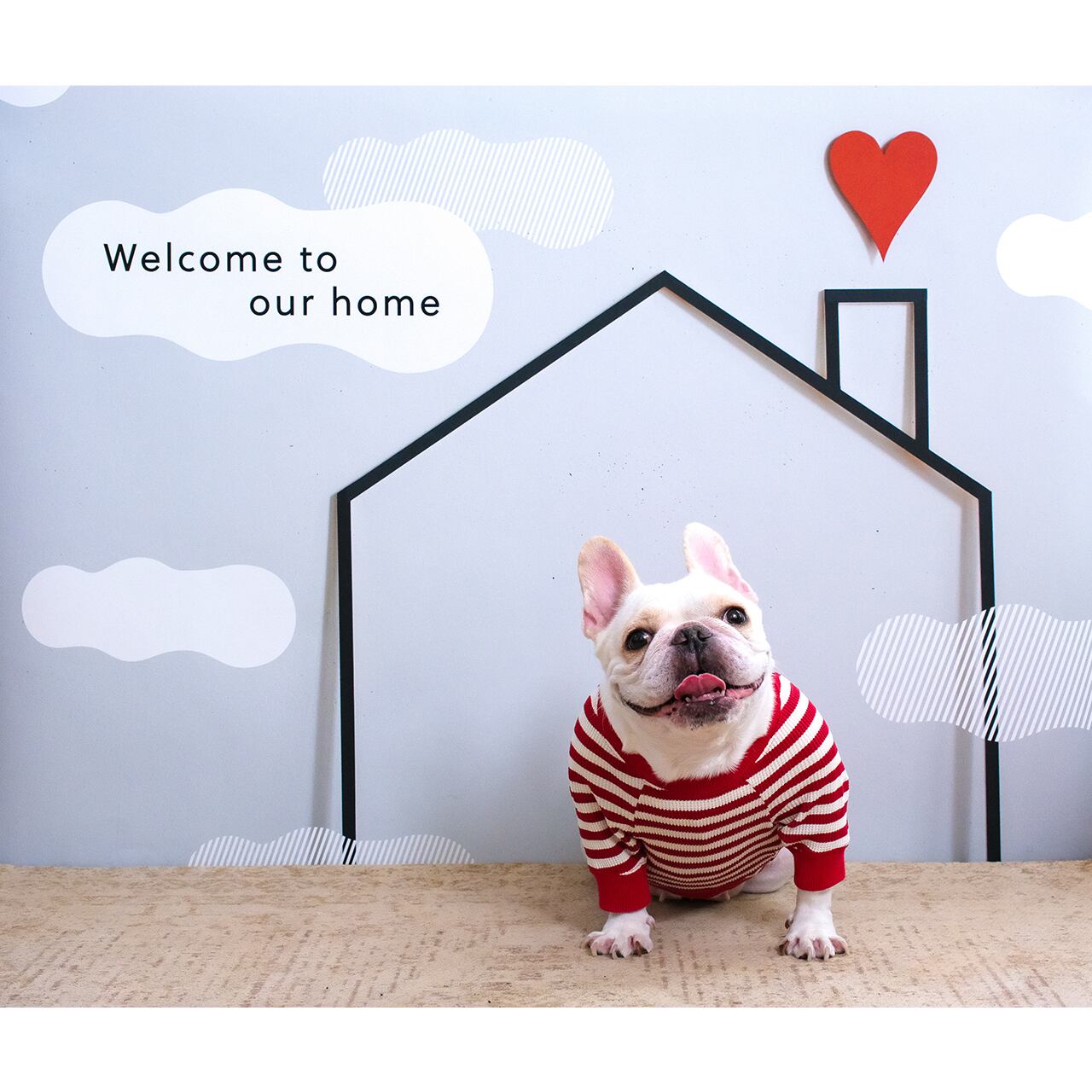 「Welcome to out home」とデザインしたメッセージの通り、かわいいワンちゃんがうちの子になってくれた記念に撮影できるようお作りしたデザイン<welcome>。家をかたどった背景に入って、大切な家族の一員が増えたお祝いをしましょう。